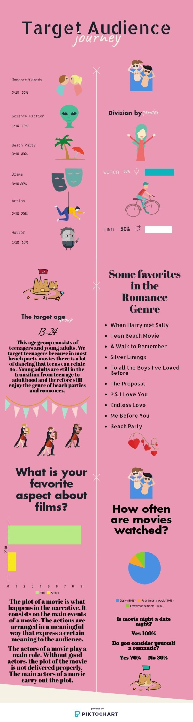 As a cohesive group we decided what audience to target for our movie based on the content of movies that match our genre. All beach party/romance movies are about young love, partying and living life to the fullest. Plots such as those tend to attract teens and young adults for they can relate and like to party. The research process was done by deciding to speak to the public. The public consisting of teens, and young adults was surveyed. We surveyed ten people around our school. There were five females and five males. We asked them questions about what kind of movies they liked and what genres they preferred. Our target age was 13 and up. We also asked what their favorite aspect of a movie is most important in their opinion. Everyone had different likes and views which was enjoyable to observe and survey.