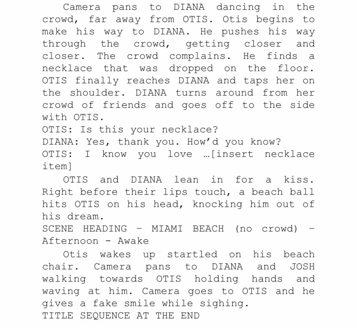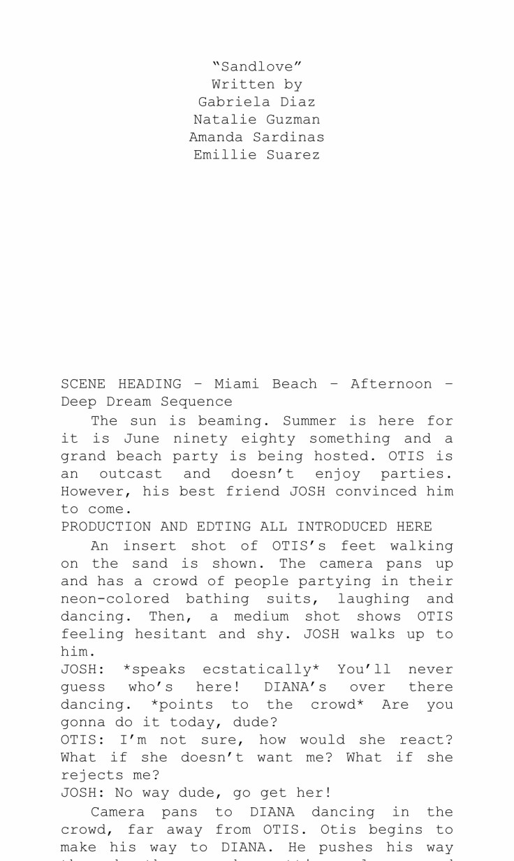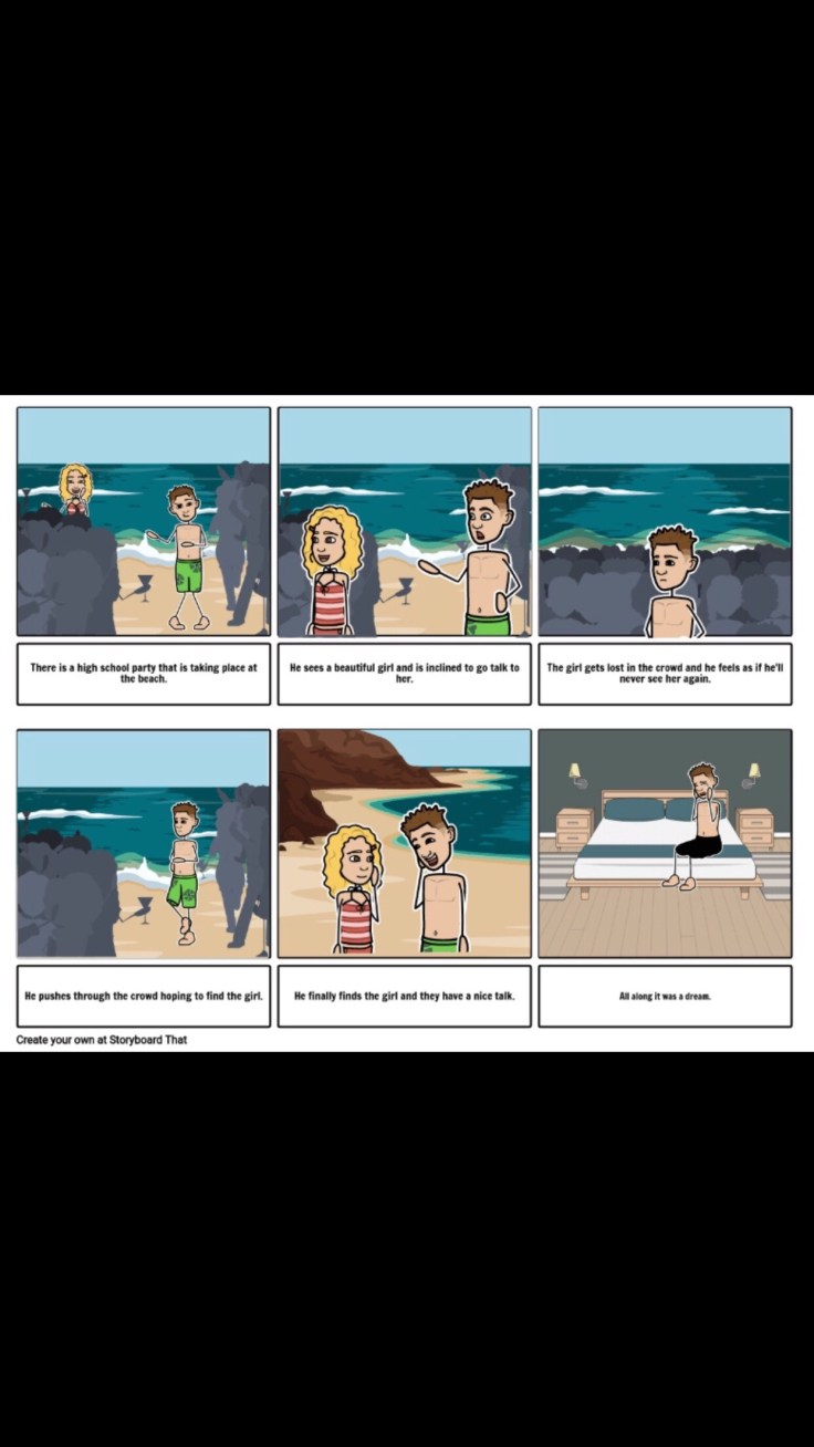 The genre we chose for our movie was beach party/romance. Our movie would begin with shots of people dancing and partying at the beach. Then we close in on a boy standing alone watching the party. He sees a beautiful girl and feels the urge to go talk and be with her as she dances and has fun. He tries to reach out to her, but there are too many obstacles in the way. The place is too crowded and there’s different activities going on. When he finally gets to her and they meet its love at first sight. She leans in to kiss him and then the scene completely shifts to the boy sleeping on his beach chair. Turns out it was all just a dream and that will be the introduction of our movie. One can assume the movie will be about this young man trying to get that girl with the help of a little romance and some beach partying.