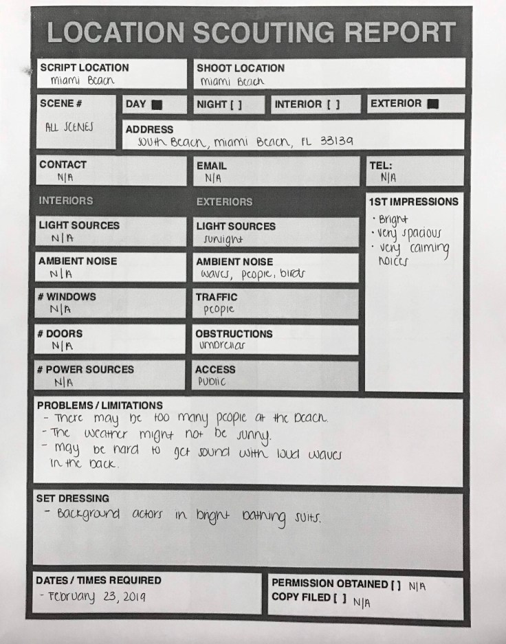 We completed a report about our location. We concluded that we will be shooting the intro in Miami Beach. It is the perfect spot for our movies plot line. Here is the report: